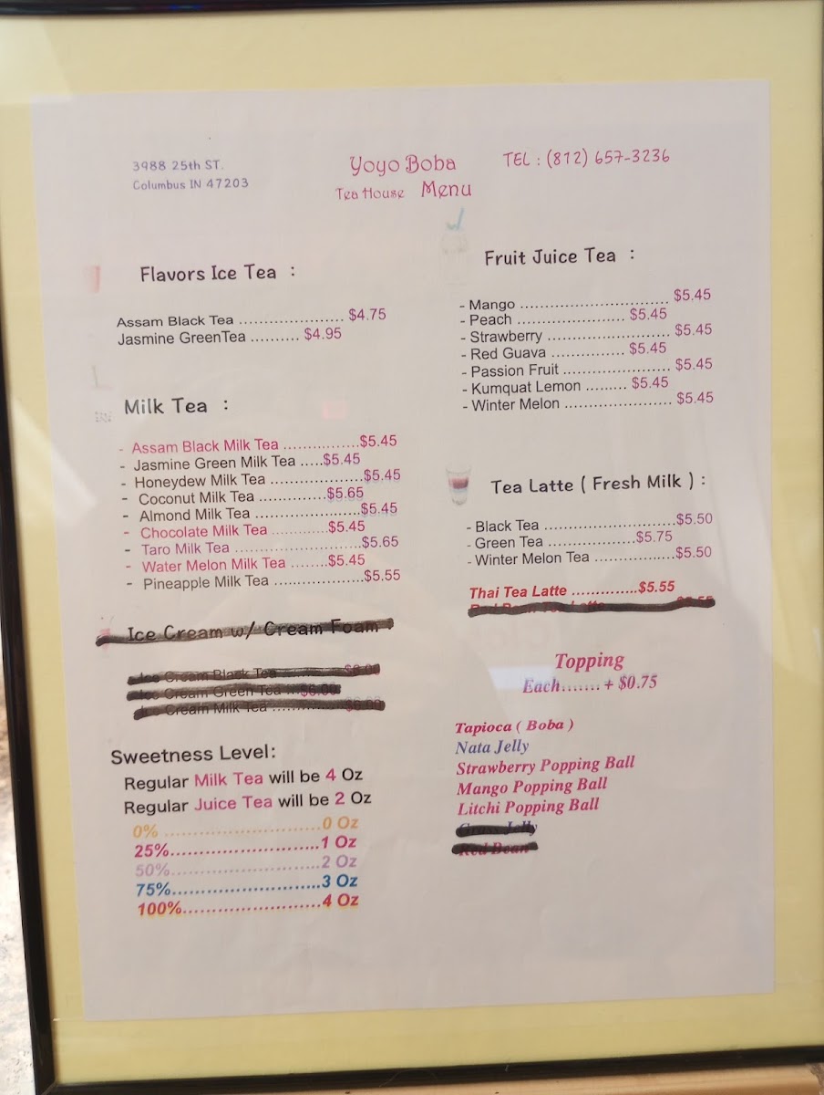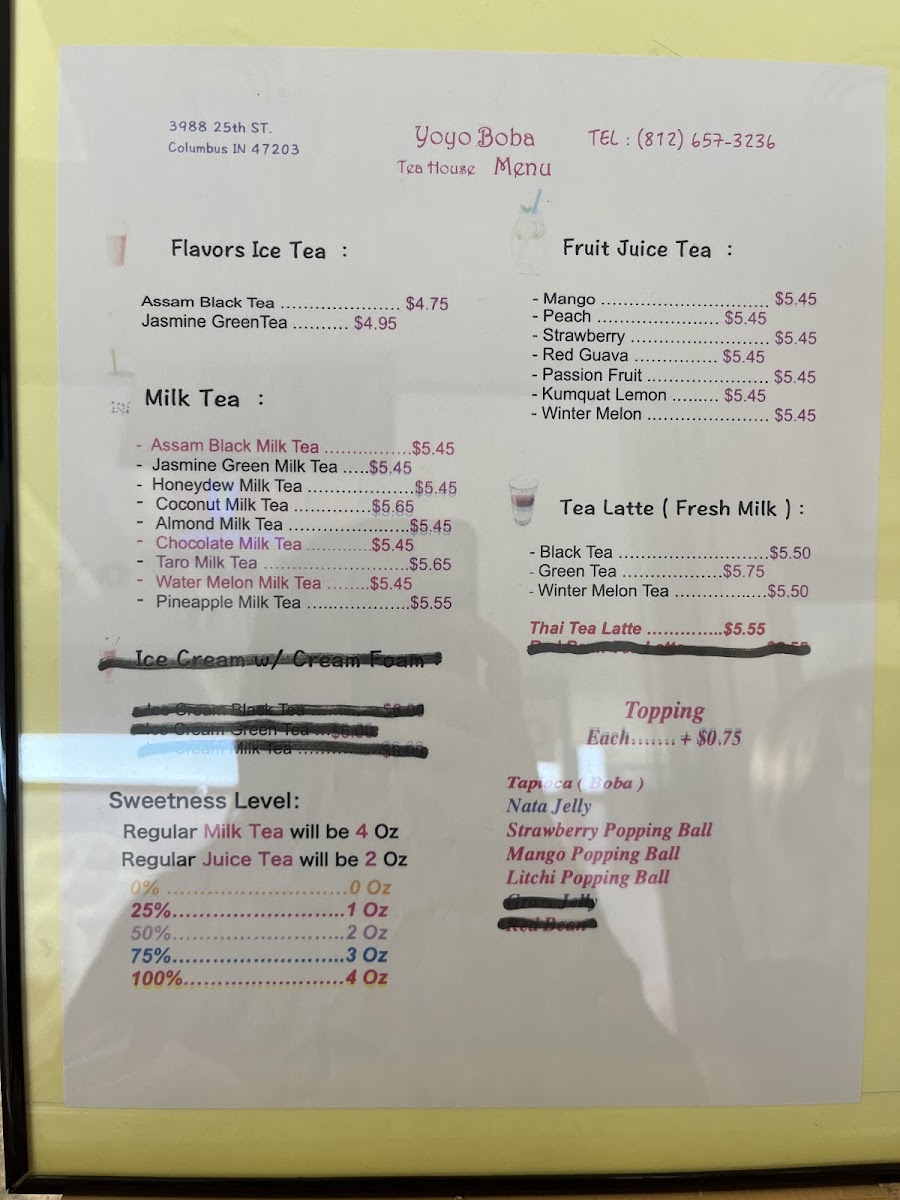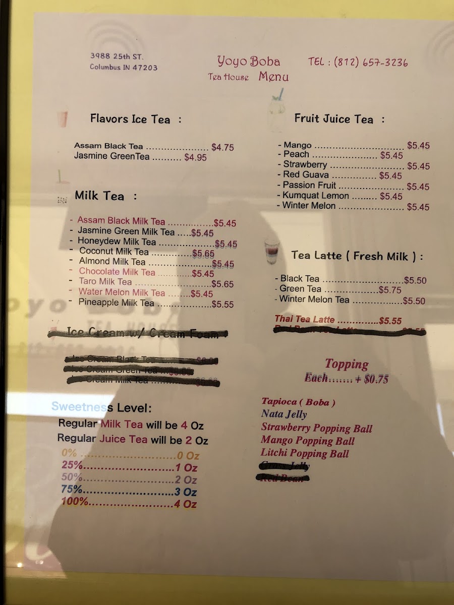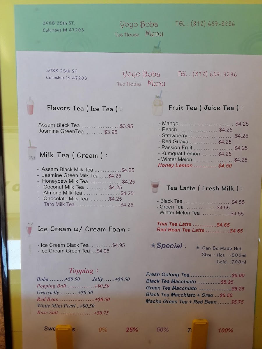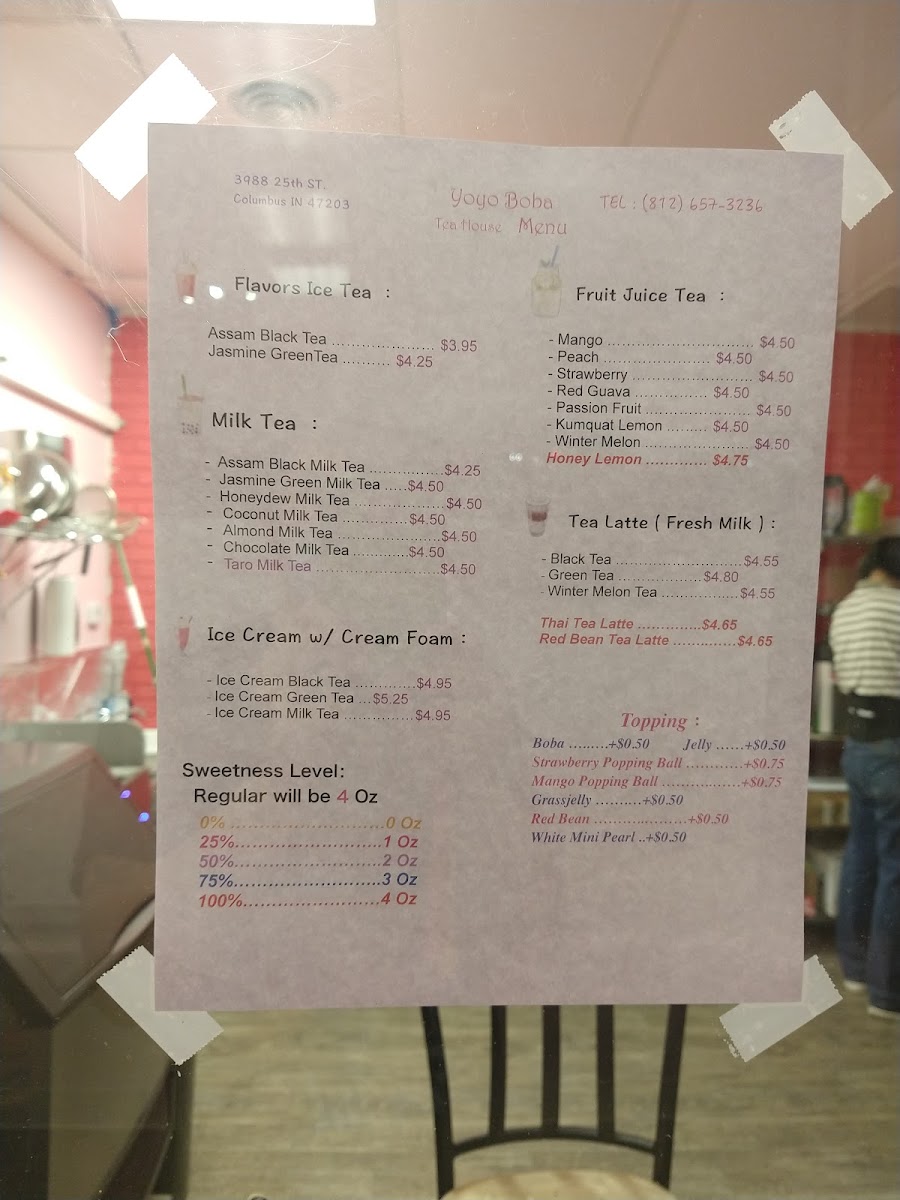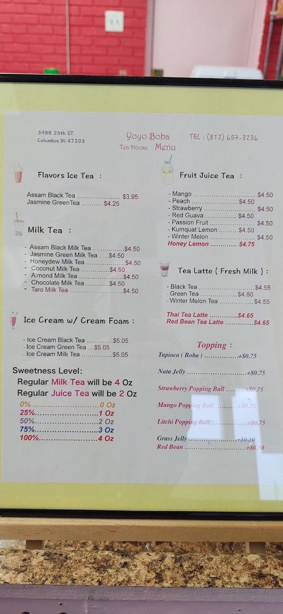 The menu at Yoyo Boba Teahouse offers a refreshing variety of drinks that cater to all tastes. Their Flavors Ice Tea includes options like Assam Black Tea and Jasmine Green Tea, perfect for a classic tea experience. For milk tea lovers, there’s a selection of Assam Black Milk Tea, Jasmine Green Milk Tea, and fruit-infused options like Honeydew Milk Tea and Coconut Milk Tea. If you’re in the mood for something a little more indulgent, their Ice Cream W/ Cream Foam offering, like Cream Milk Tea, will satisfy your sweet tooth. Those looking for fruity drinks can enjoy the Fruit Juice Tea choices, including Red Guava, Passion Fruit, and Winter Melon. For a creamier twist, the Tea Lattes like Black Tea, Green Tea, and Thai Tea Latte are great choices. To enhance your drink, there are various add-ins such as Tapioca, Nata Jelly, and different Popping Balls including Strawberry, Mango, and Litchi. The menu is both diverse and customizable, ensuring there’s something for everyone to enjoy at an affordable price.